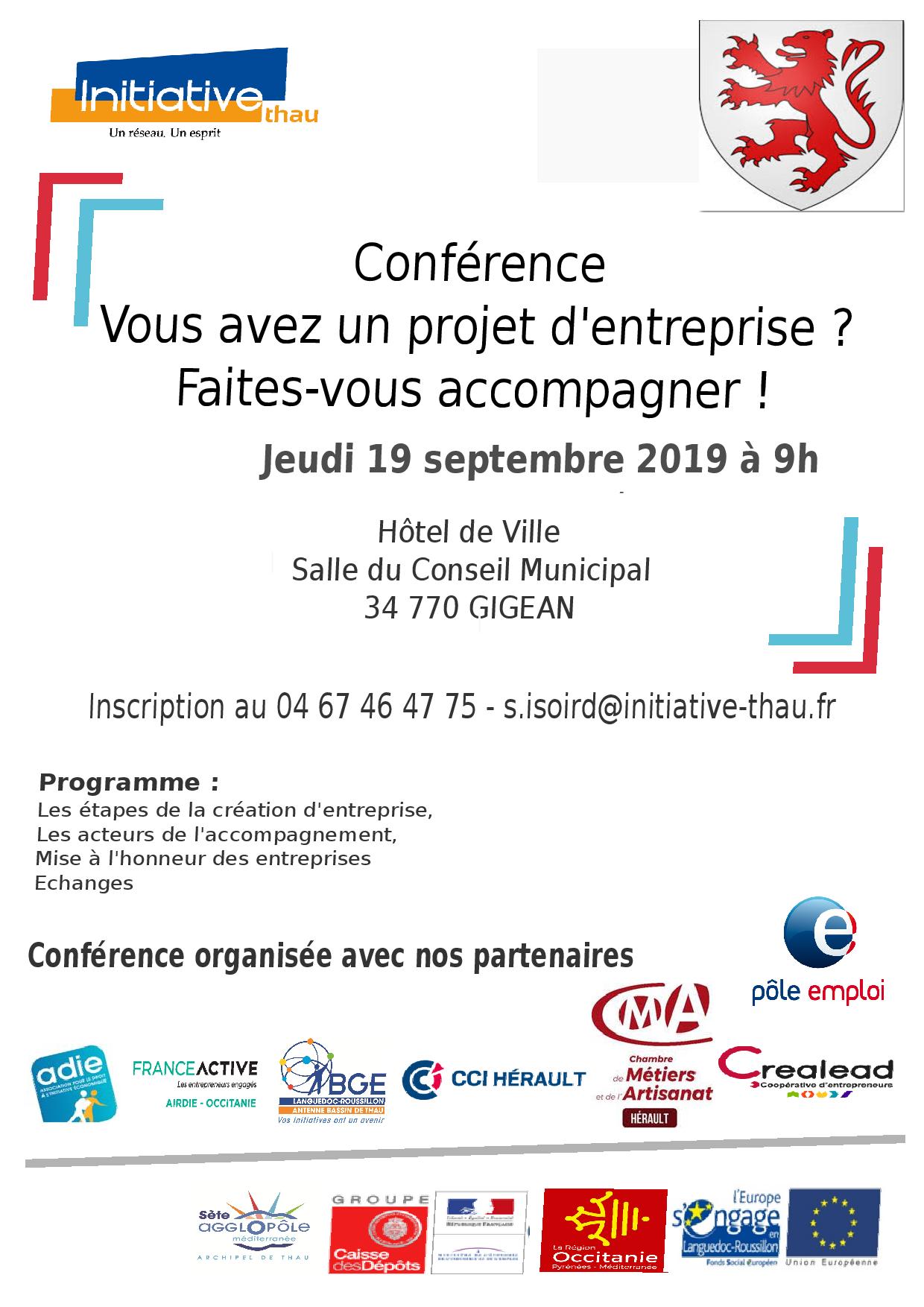 Initiative Thau organise en partenariat avec la Mairie de Gigean, une conférence sur la création d’entreprise, avec ses partenaires l’ADIE, l’AIRDIE, la CCI de l’Hérault, la Chambre de métiers et de l’Artisanat, la BGE, CREALEAD et Pôle Emploi dans la salle d’Honneur à la Mairie de Gigean.