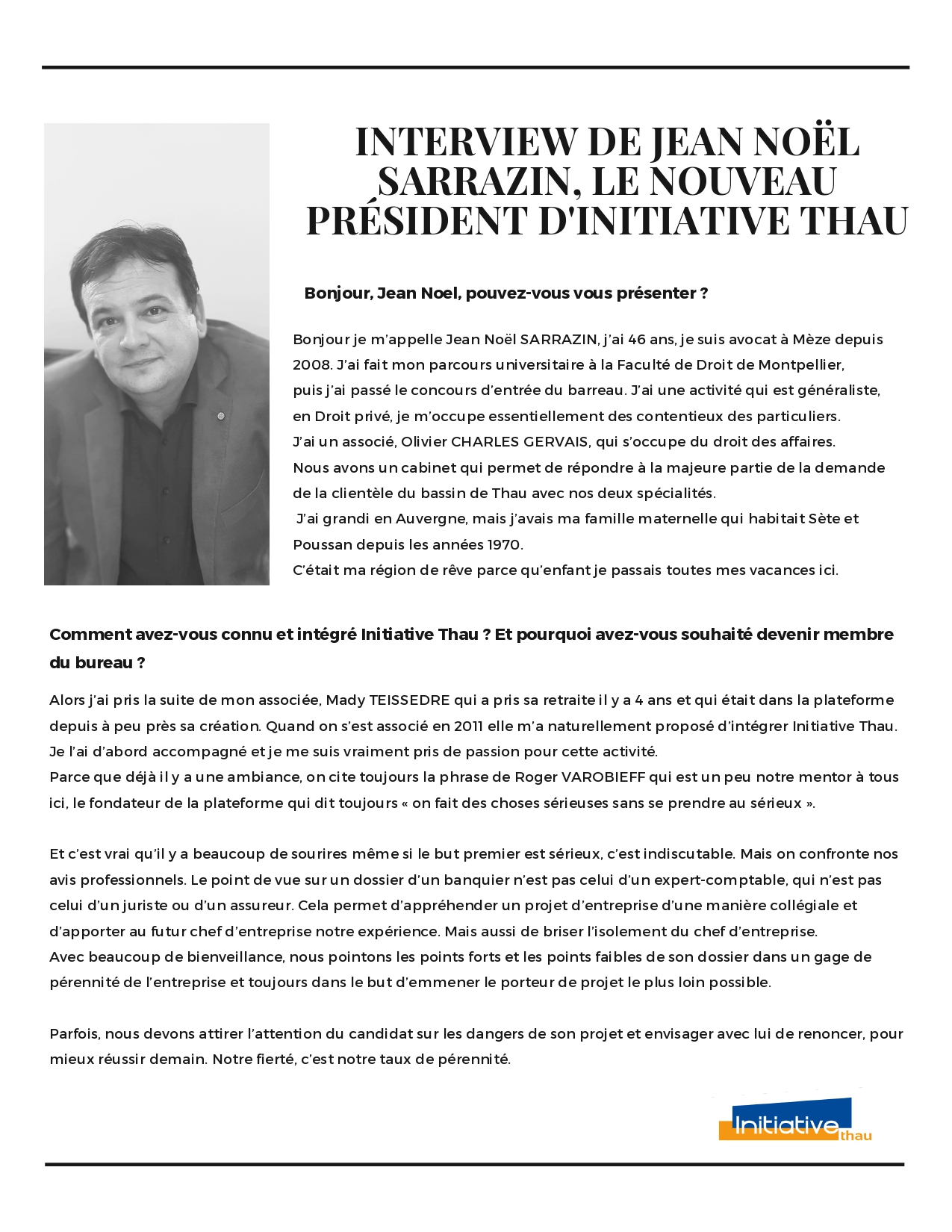 Depuis le 1er juillet dernier, Jean-Noël SARRAZIN, Avocat à Mèze est devenu le nouveau Président d'Initiative Thau.